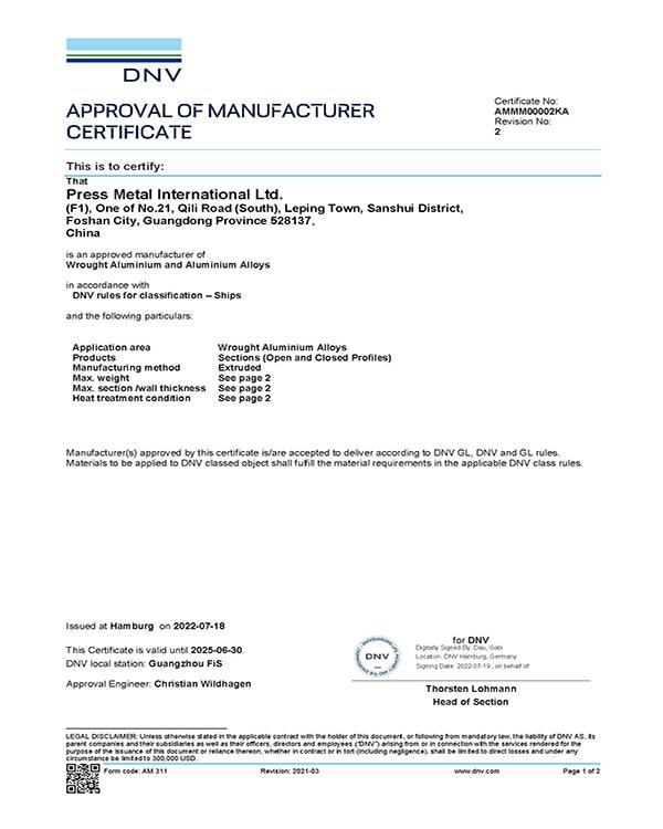 - 公司生产的铝合金材料通过首个船级社——DNV(挪威船级社)认证