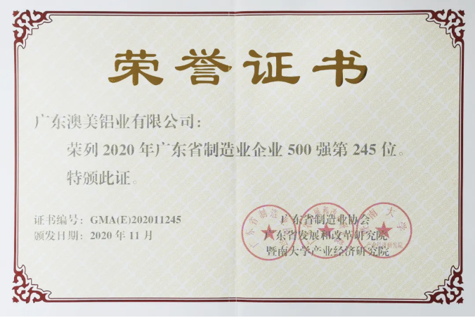 - 首次荣膺广东省制造业500强企业