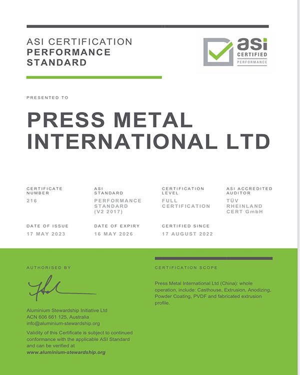 铝业管理倡议ASI绩效标准认证