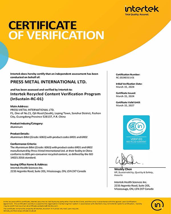 回收铝Intertek-RCV证书